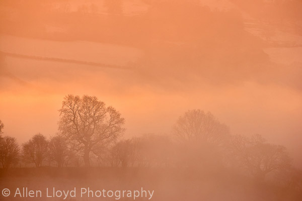 Misty trees at dawn, near Bwlch