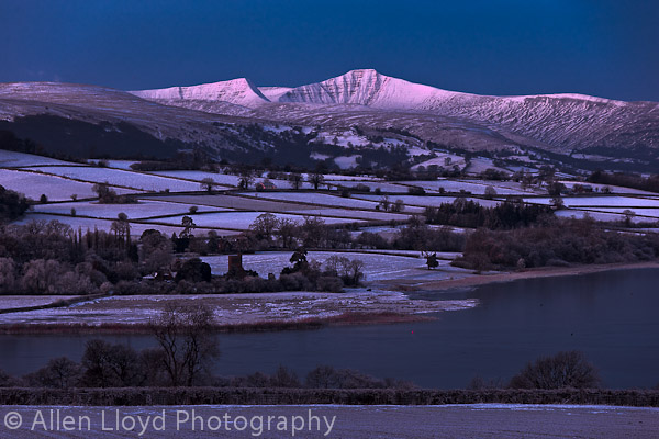 Dawn at Llangorse Lake in Winter, with Peyfan visible behind