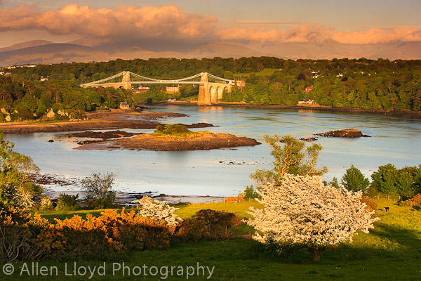 Menai Suspension Bridge and Snowdon Mountain Range viewed from Anglesey