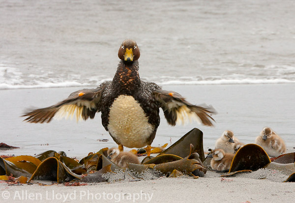 Steamer Duck with family, a flightless duck, Sealion Island