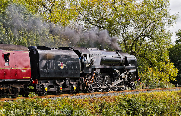 9F, 92212 hauls a passenger train, towards Sterns, during the SVR Autumn Steam Gala