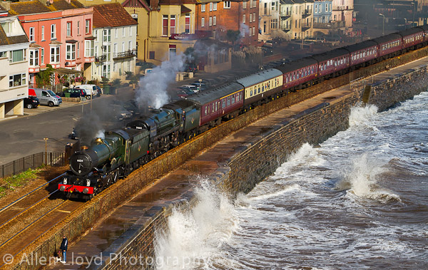 6024 "King Edward I" and 70013 "Oliver Cromwell" cross the sea wall at Dawlish, with a Bristol to Plymouth steam excurion.